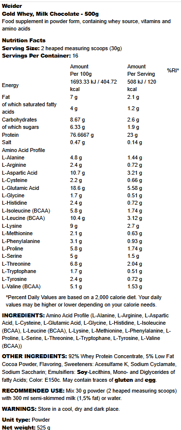 Gold Whey Weider Milk Chocolate – aukštos kokybės išrūgų baltymų milteliai su pieno šokolado skoniu, padedantys raumenų augimui ir atsistatymui, su dideliu baltymų kiekiu ir mažai cukraus.