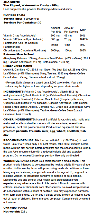 The Ripper! JNX Sports Watermelon Candy – prieštreniruotinis papildas su vandensmelono saldumo skoniu, suteikiantis energijos ir koncentracijos treniruotėms. Padeda pagerinti fizinį našumą ir ištvermę.